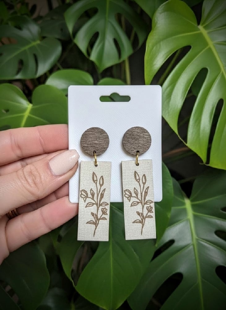 Boho Wildflower Earrings. Linen textured engraved wood damgle with stained wood circle. Lightweight and hypoallergenic.