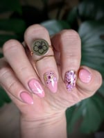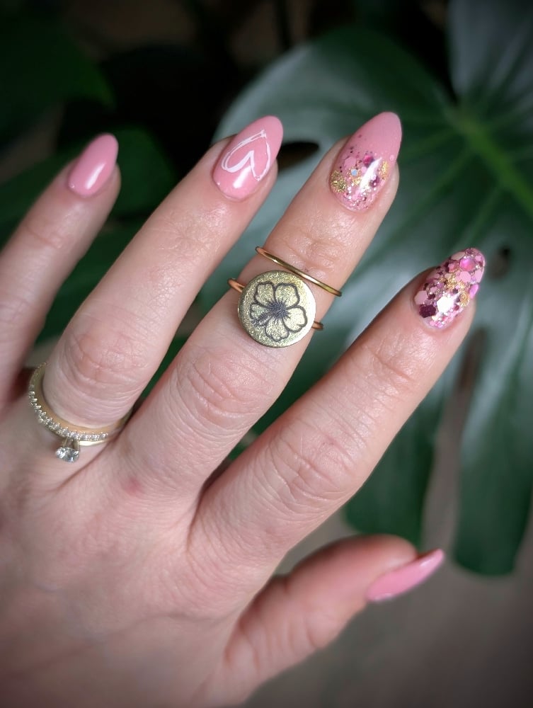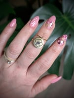 Stackable set! Hibiscus on gold flat bezel with thin gold band.