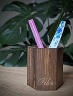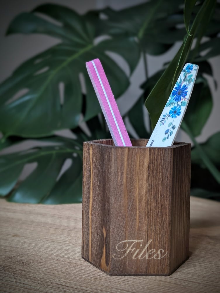The Wooden Hexagon Tool Cup is a sleek and versatile organizer, perfect for keeping your nail files, brushes, and precision tools within easy reach. Crafted from high-quality wood in a modern hexagon shape, it combines style with practicality. Personalize it with your own custom text for a unique touch that reflects your brand or personality. Whether for a professional nail desk or a home setup, this cup keeps your essentials organized while adding a natural, elegant accent to your workspace.