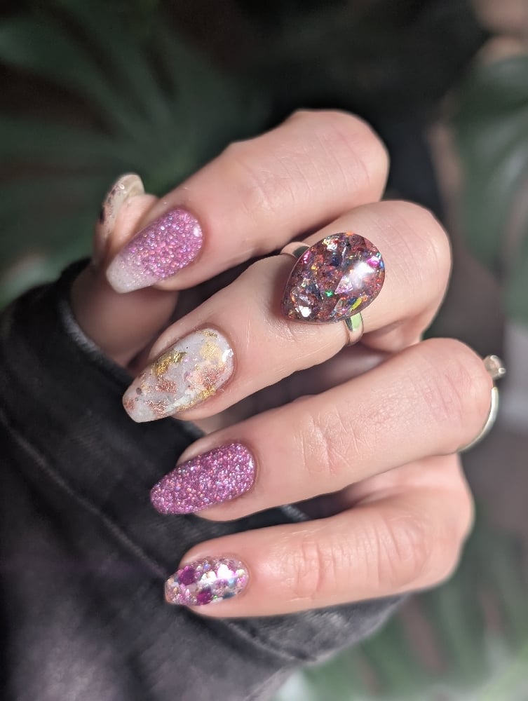 Mix of spring colors set in a resin tear drop.
