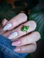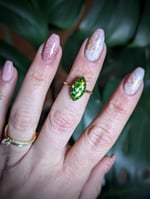 Beautiful green glitter resin gem in a marquise setting. Adjustable ring base.