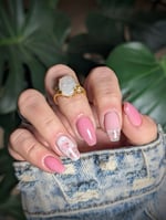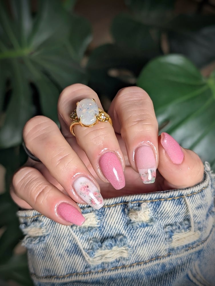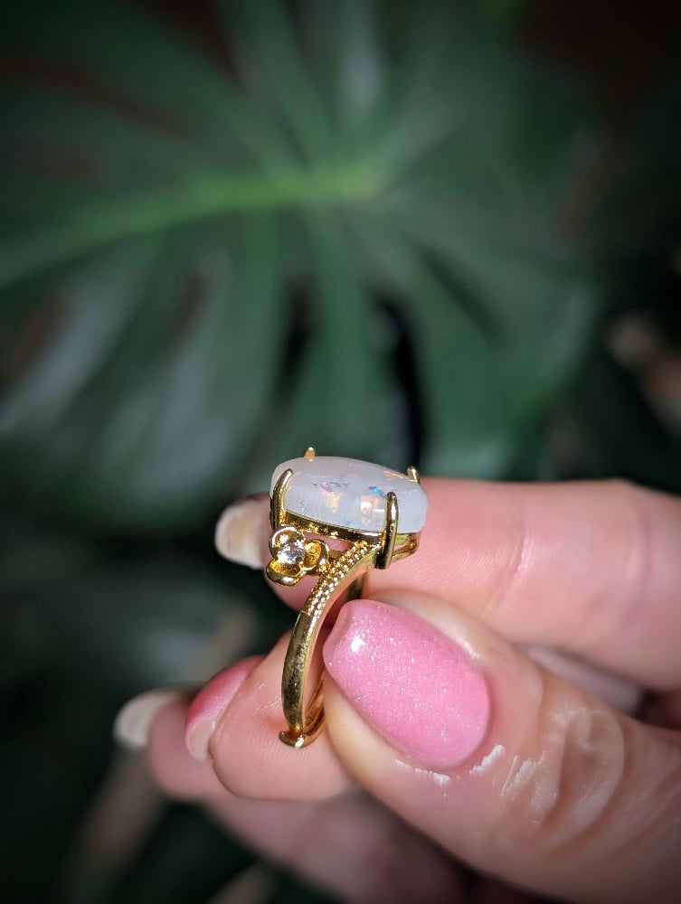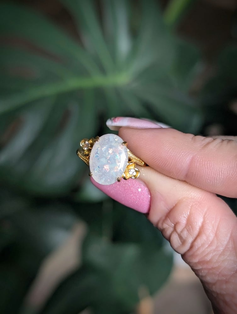 Beautiful Opal inspired resin faux stone seated in a four prong adjustable band with decorative flowers and gem on each side.