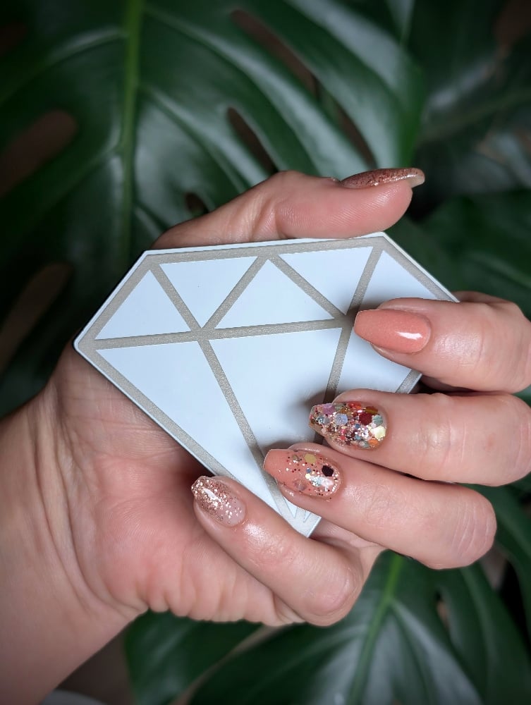 White Diamond nailfie prop. Cut from acrylic and laser engraved.